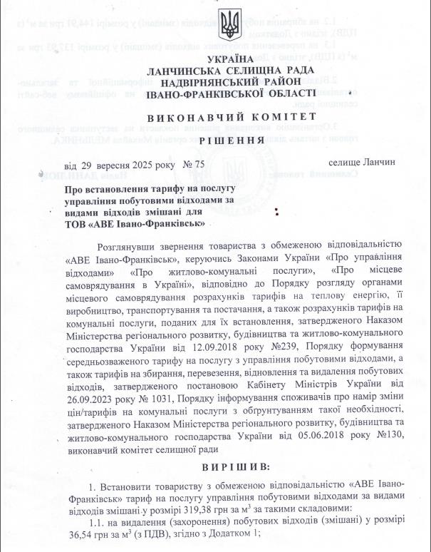 ТОВ «АВЕ Івано-Франківськ» повідомляє, що згідно рішення виконавчого комітету Ланчинської селищної ради Надвірнянського району Івано-Франківської області від 29.09.2025 року №75 Товариству з обмеженою відповідальністю «АВЕ Івано-Франківськ» затверджено тариф на послуги із збирання та перевезення побутових відходів на території Ланчинської територіальної громади розмірі 319,38 грн за 1 м. куб. для всіх категорій споживачів.