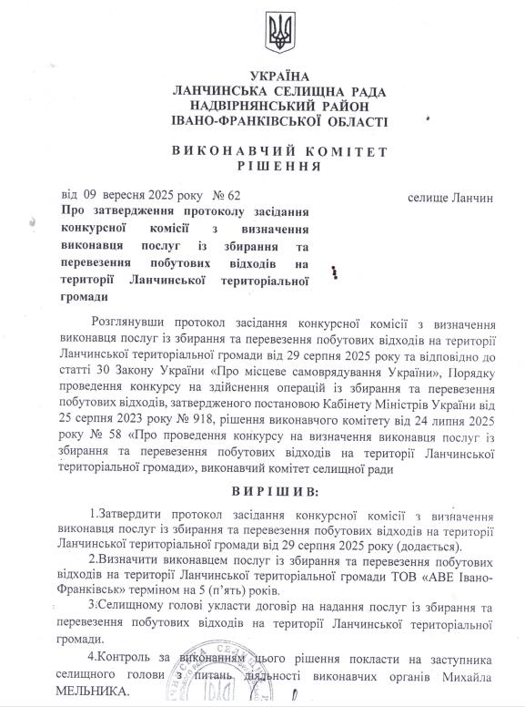 Відповідно до рішення Виконавчого комітету Ланчинської селищної ради № 62 від 09.09.2025 року переможцем конкурсу на вивезення побутових відходів є Товариство з обмеженою відповідальністю «АВЕ Івано-Франківськ».