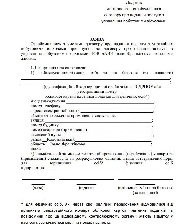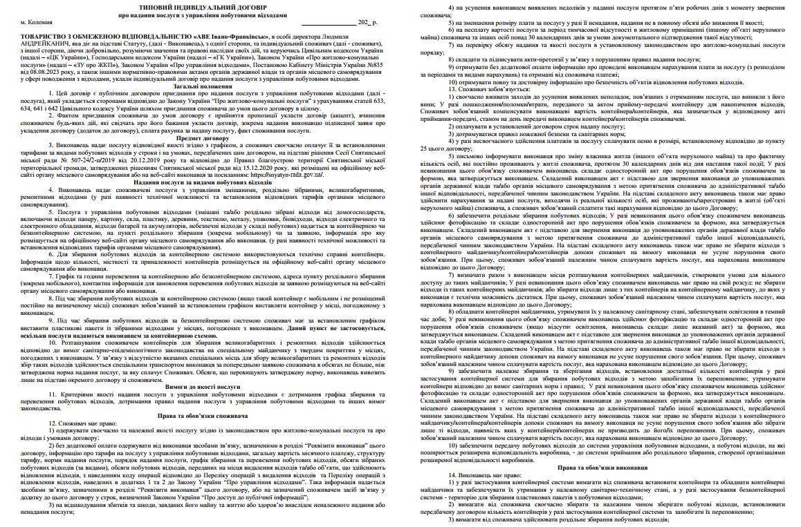 НОВА РЕДАКЦЯ ТИПОВОГО ІНДИВІДУАЛЬНОГО ДОГОВОРУ ПРО НАДАННЯ ПОСЛУГИ З УПРАВЛІННЯ ПОБУТОВИМИ ВІДХОДАМИ НА ТЕРИТОРІЇ МІСТА СНЯТИН