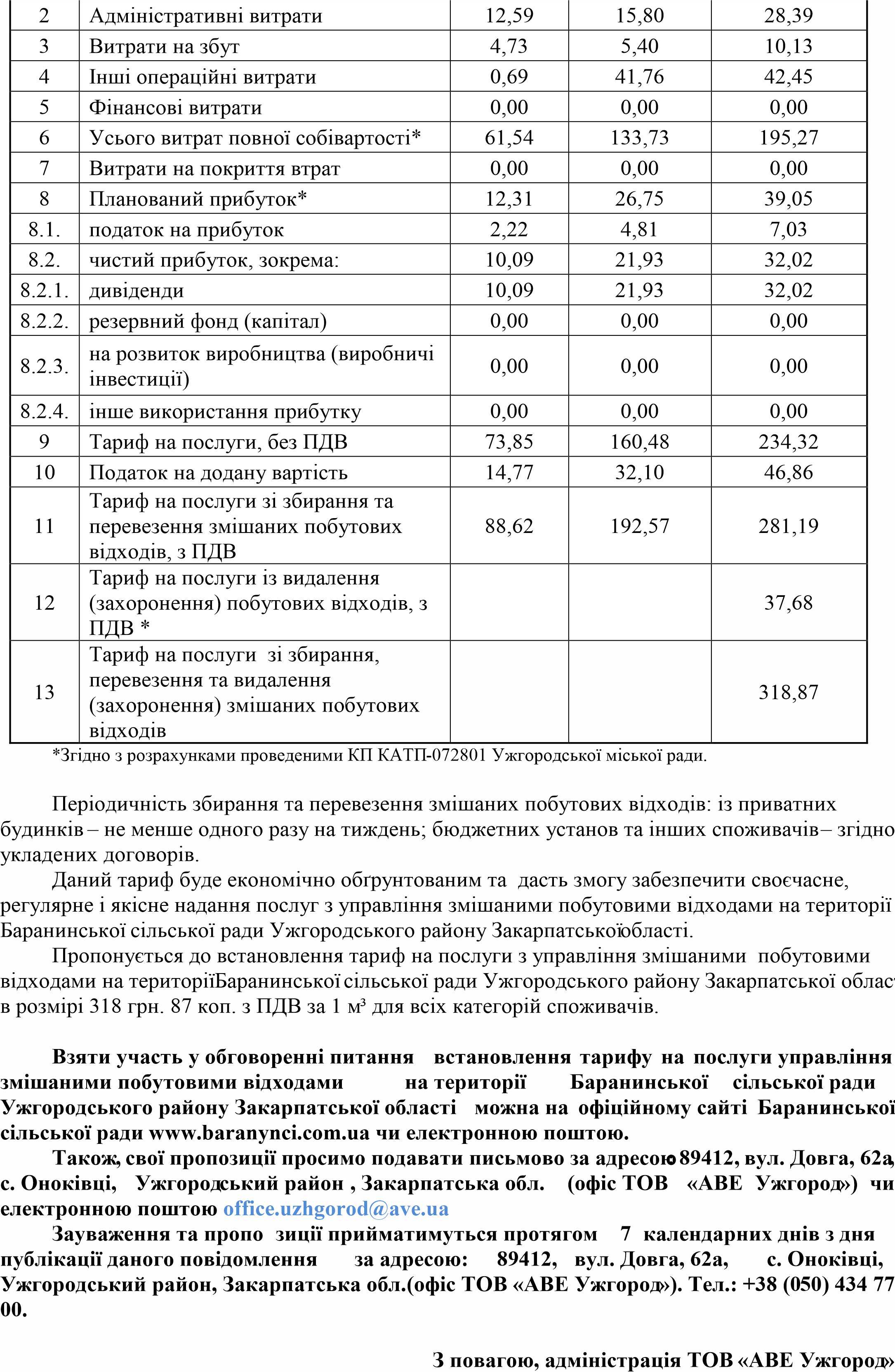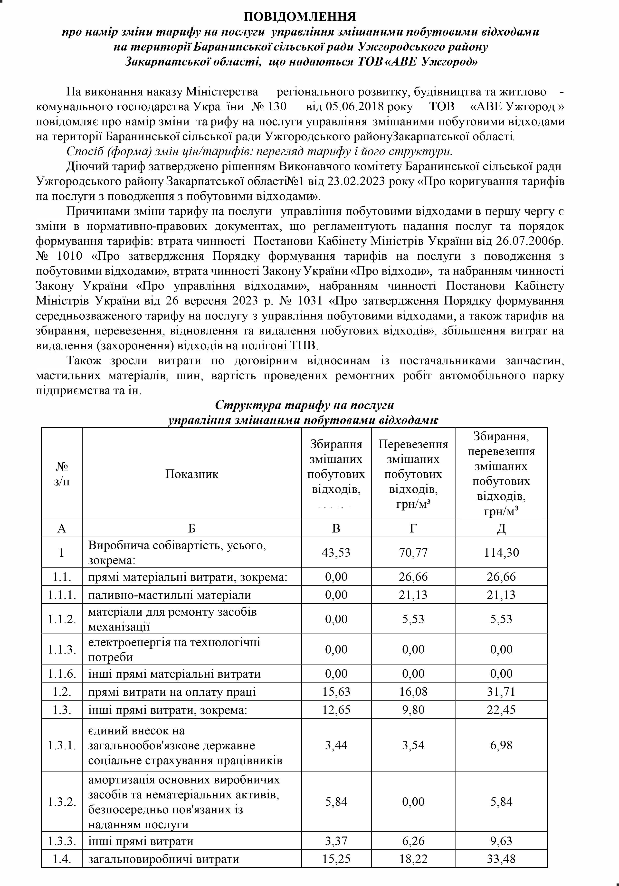 ПОВІДОМЛЕННЯ про намір зміни тарифу на послуги управління змішаними побутовими відходами на території Баранинської сільської ради Ужгородського району Закарпатської області, що надаються ТОВ «АВЕ Ужгород»