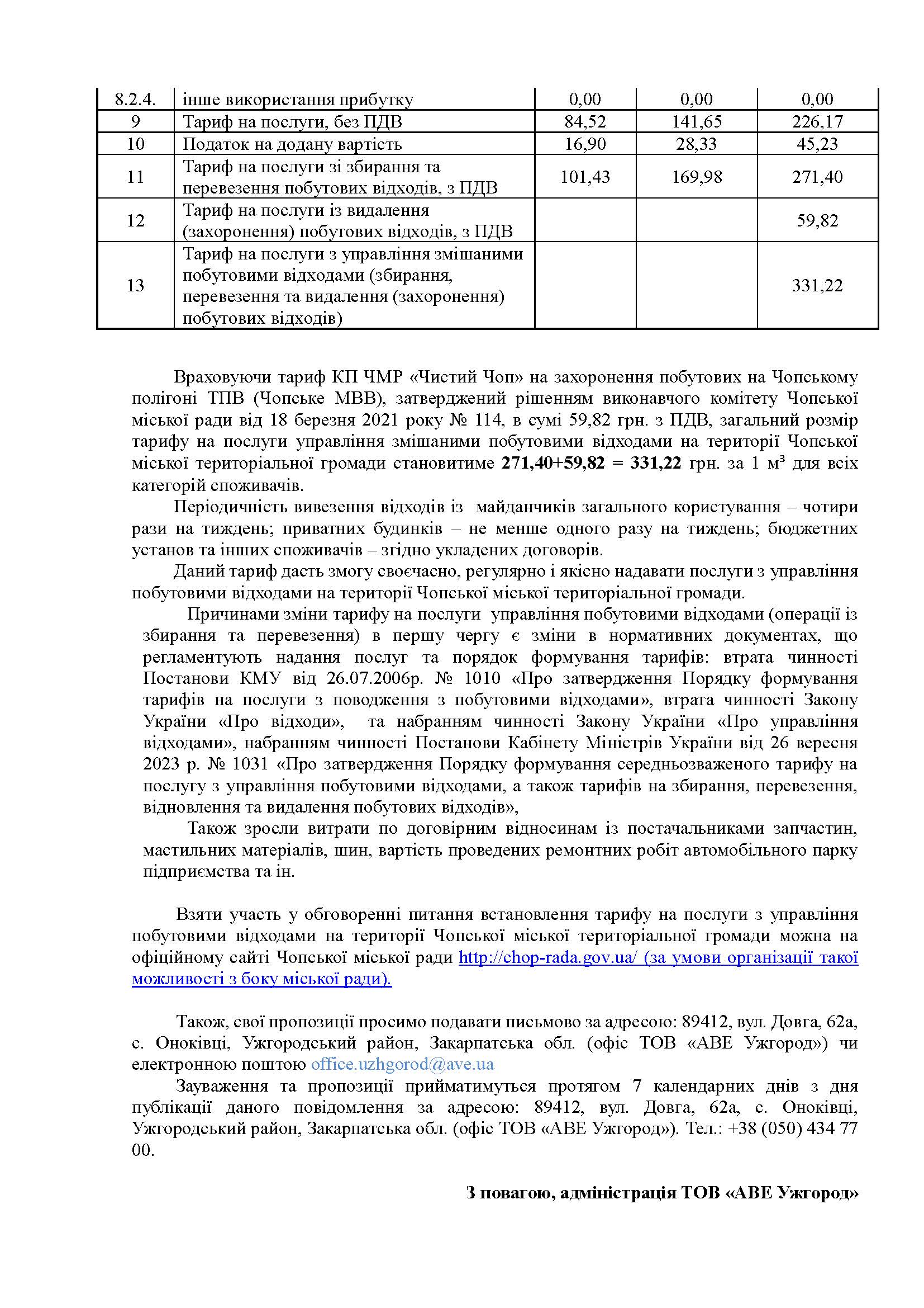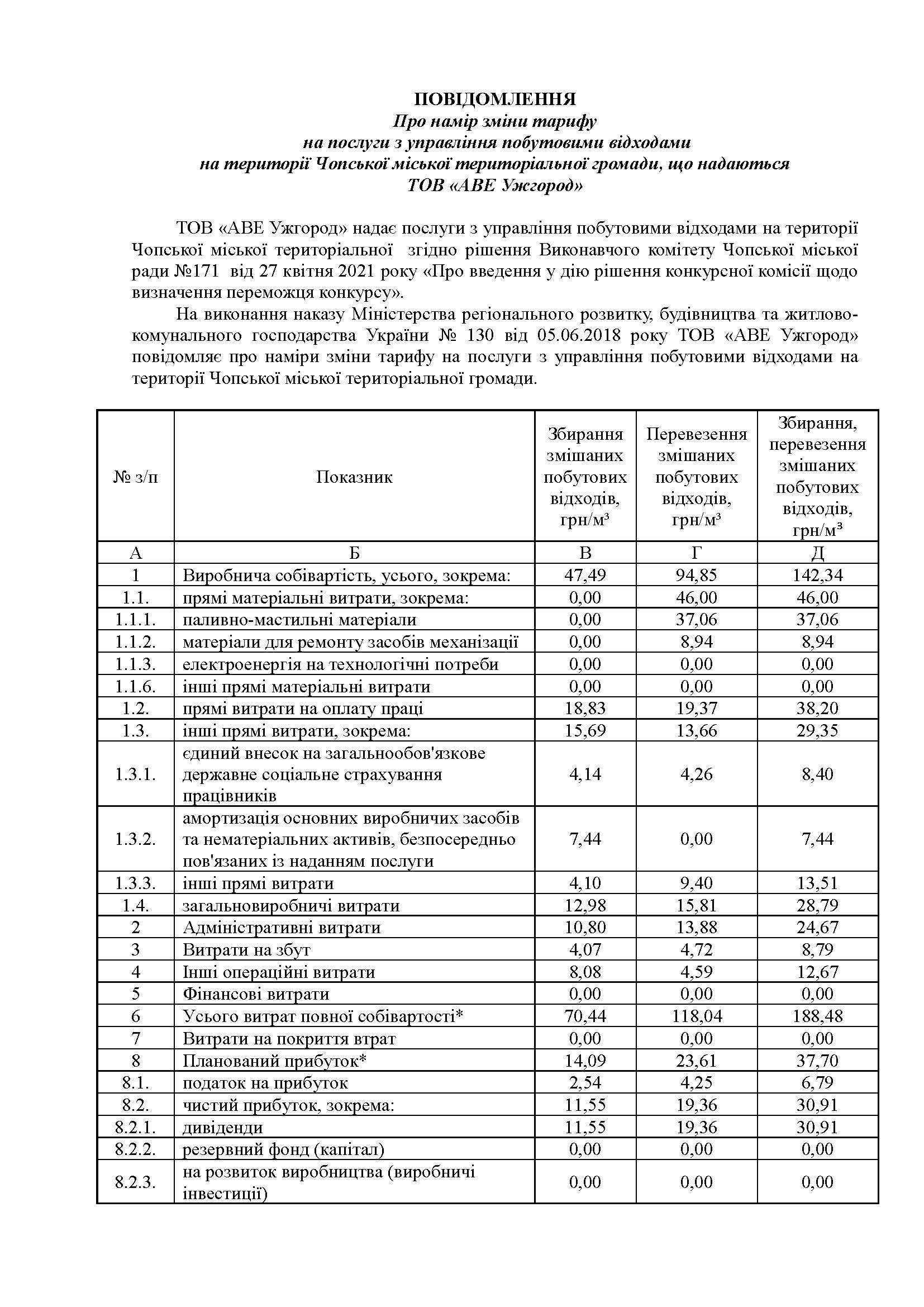 ПОВІДОМЛЕННЯ ПРО НАМІР ЗМІНИ ТАРИФУ НА ПОСЛУГИ УПРАВЛІННЯ ЗМІШАНИМИ ПОБУТОВИМИ ВІДХОДАМИ НА ТЕРИТОРІЇ ЧОПСЬКОЇ ТЕРИТОРІАЛЬНОЇ ГРОМАДИ УЖГОРОДСЬКОГО РАЙОНУ ЗАКАРПАТСЬКОЇ ОБЛАСТІ, ЩО НАДАЮТЬСЯ ТОВ «АВЕ УЖГОРОД»