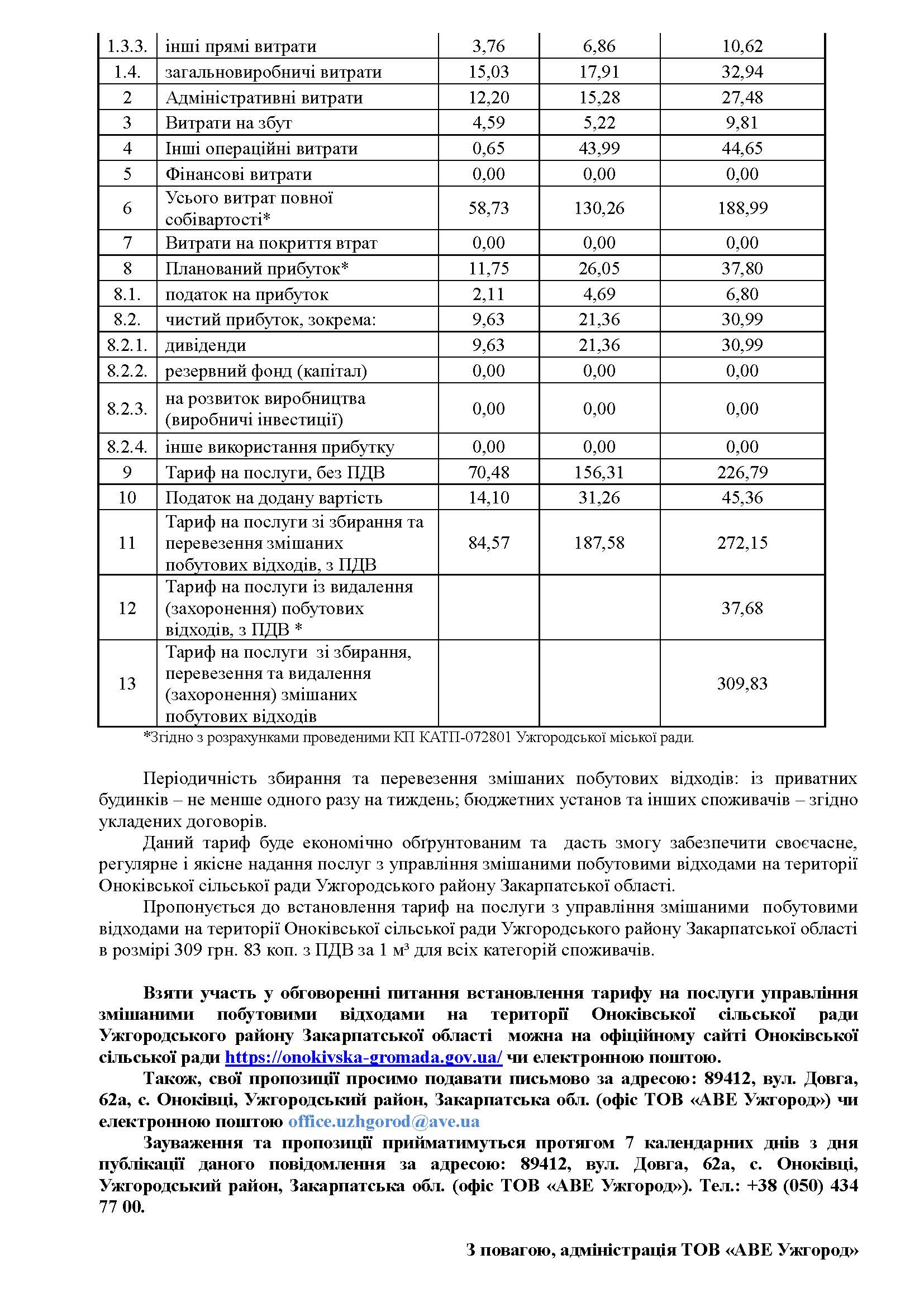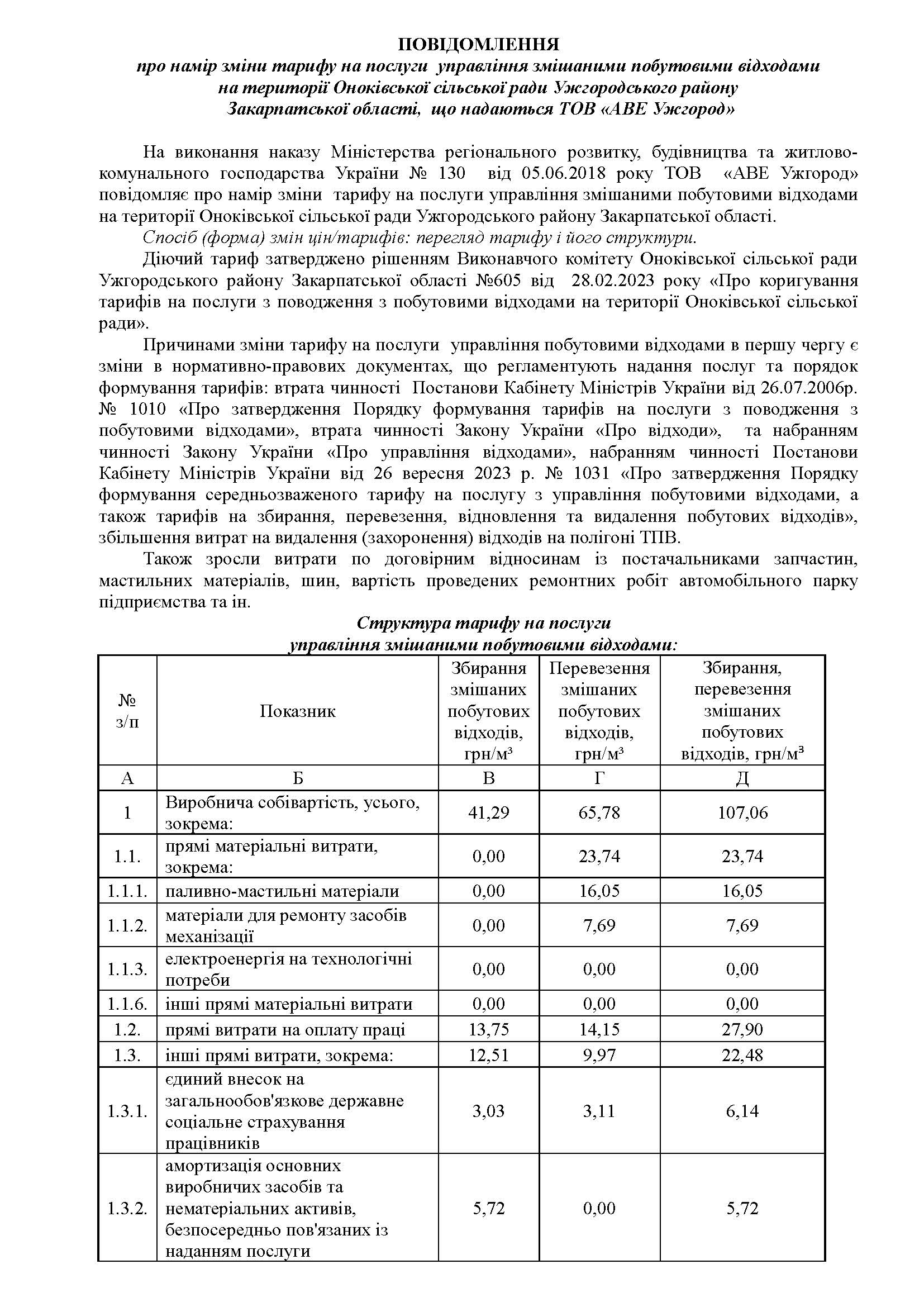 ПОВІДОМЛЕННЯ про намір зміни тарифу на послуги управління змішаними побутовими відходами на території Оноківської сільської ради Ужгородського району Закарпатської області, що надаються ТОВ «АВЕ Ужгород»