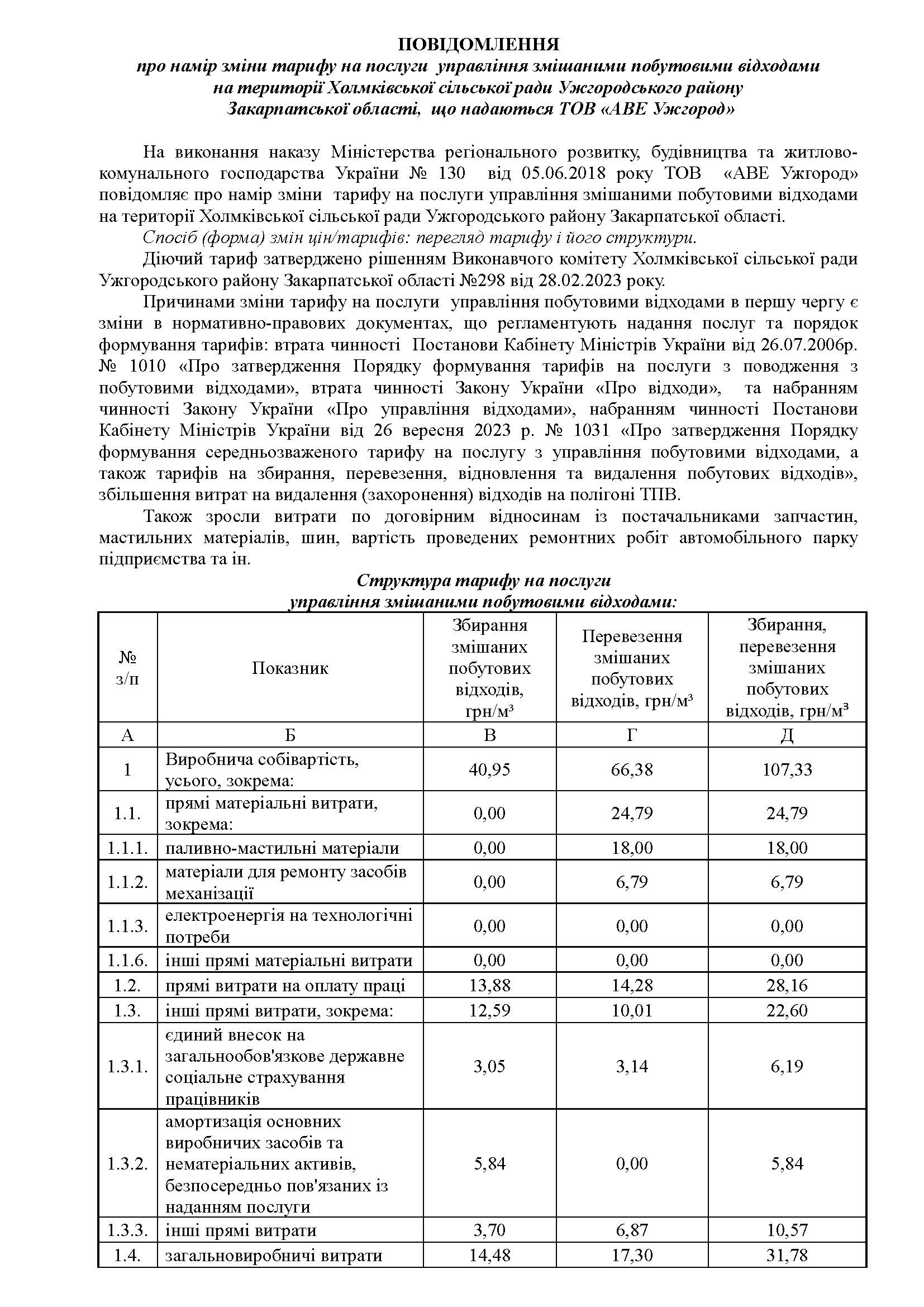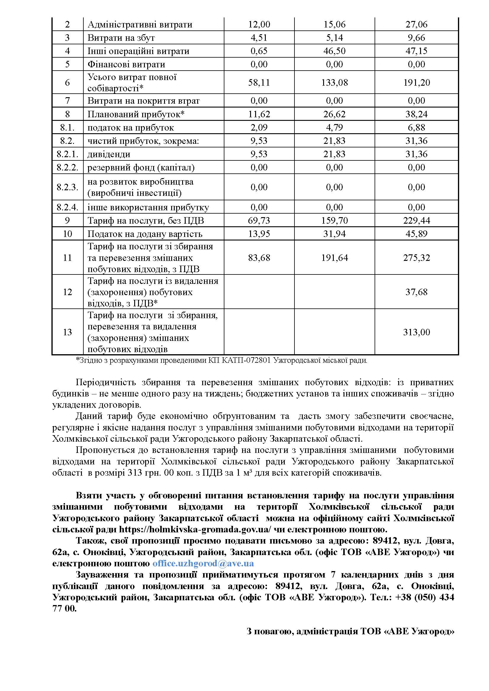 ПОВІДОМЛЕННЯ про намір зміни тарифу на послуги управління змішаними побутовими відходами на території Холмківської сільської ради Ужгородського району Закарпатської області, що надаються ТОВ «АВЕ Ужгород»