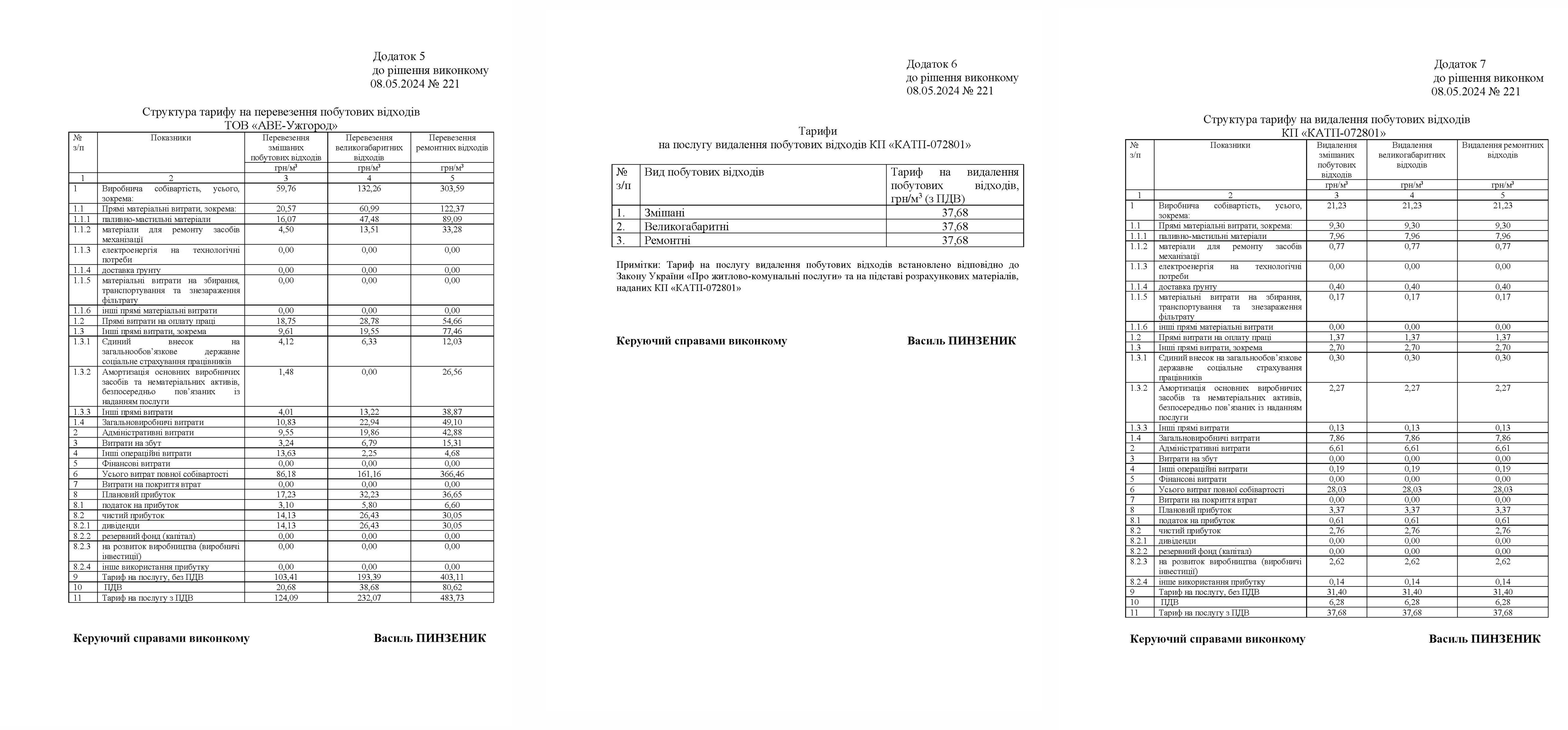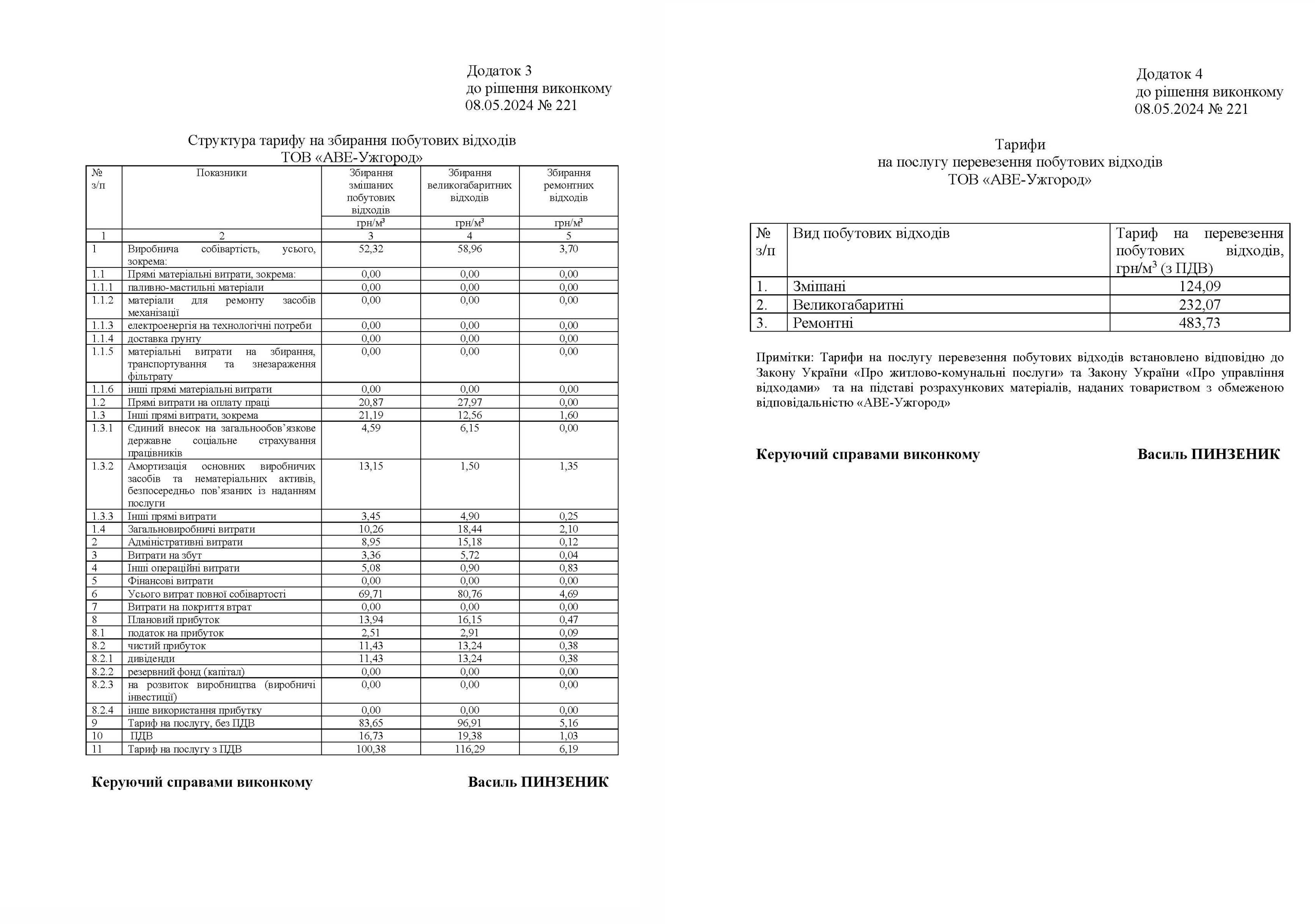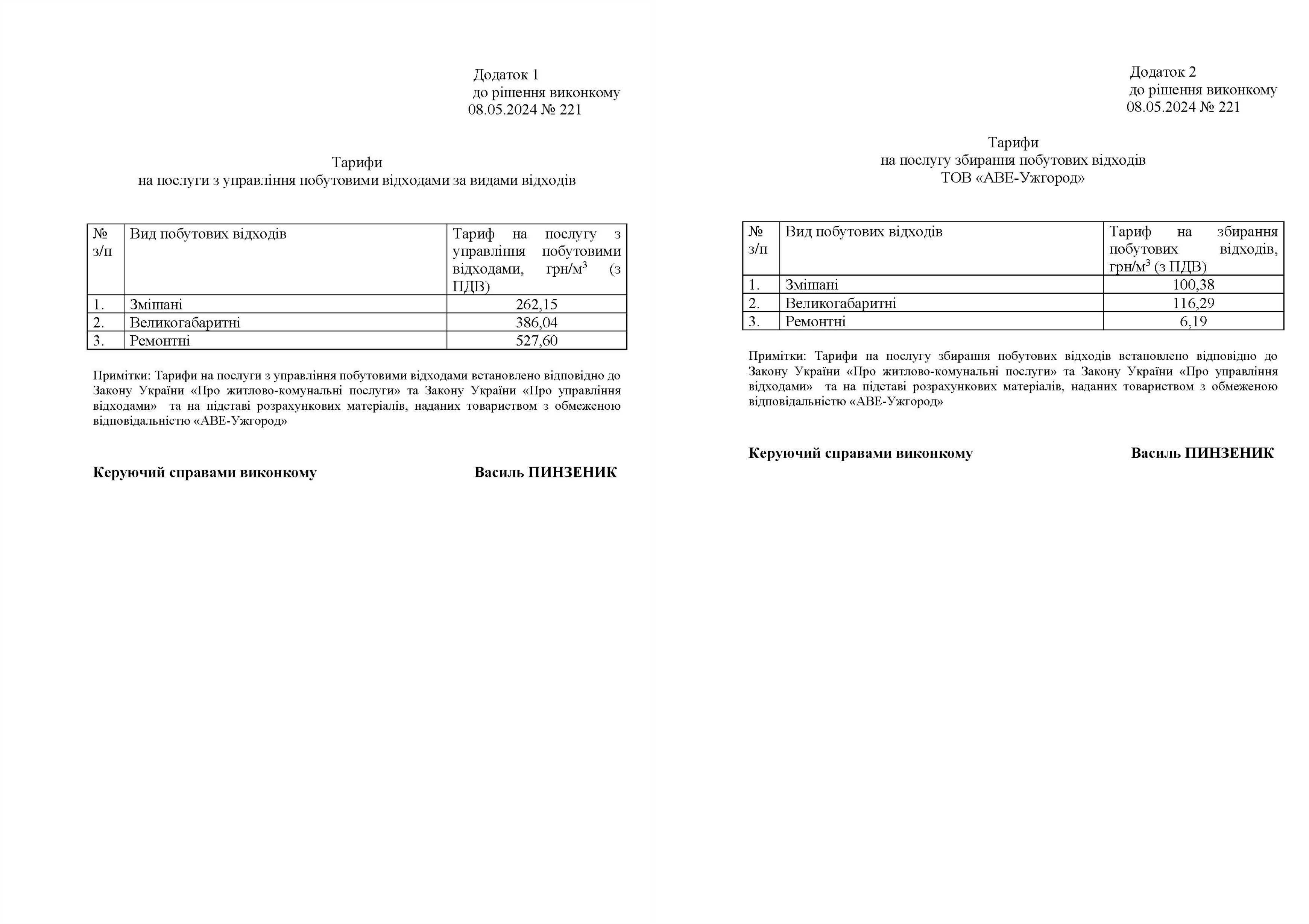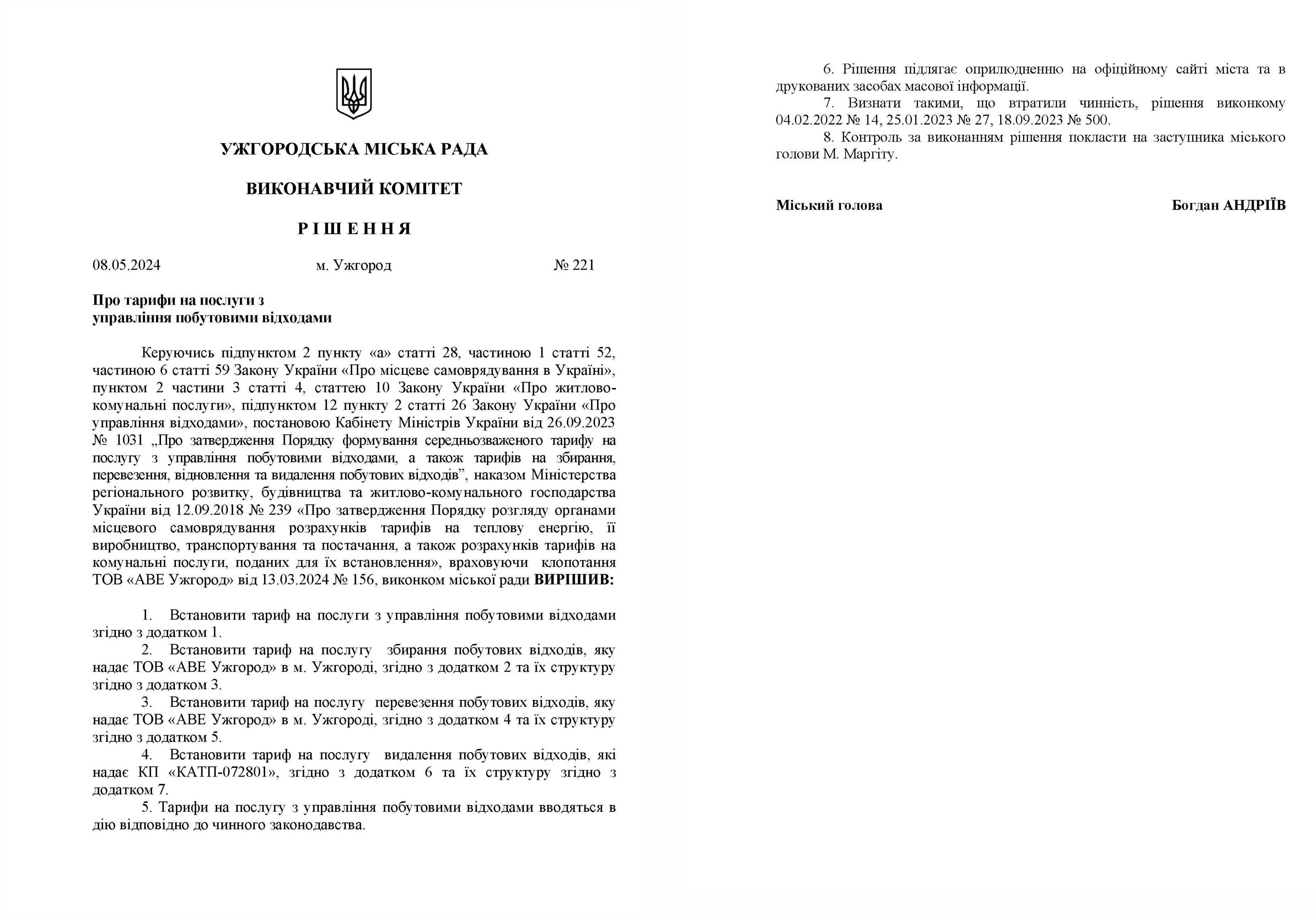 ТОВ «АВЕ Ужгород» повідомляє, що Рішенням Виконавчого комітету Ужгородської міської ради від 08.05.2024 року №14 затверджено середньозважені тарифи на послуги з управління побутовими відходами на території міста Ужгород, який становить за видами побутових відходів: