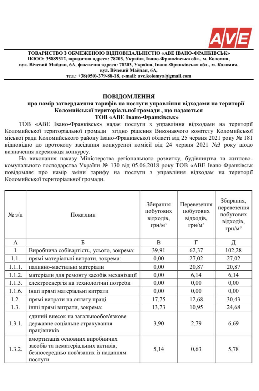 про намір затвердження тарифів на послуги управління відходами на території Коломийської територіальної громади , що надаються ТОВ «АВЕ Івано-Франківськ»