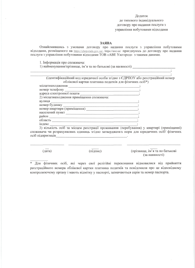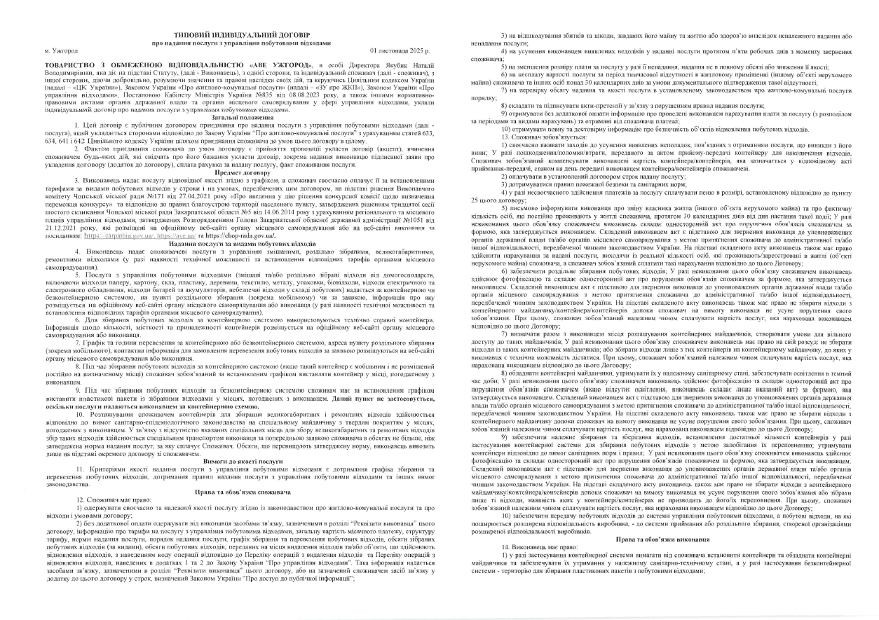 Товариство з обмеженою відповідальністю «АВЕ УЖГОРОД» (надалі – «Виконавець»), як Виконавець послуг з управління побутовими відходами на території Чопської міської територіальної громади, інформує про публікацію в новій редакції індивідуального договору про надання послуги з управління побутовими відходами на виконання рекомендацій Адміністративної колегії Західного міжобласного територіального відділення Антимонопольного комітету України №63/16-рк/к від 21.10.2025 року, який є публічним договором приєднання. (надалі – «Договір»).