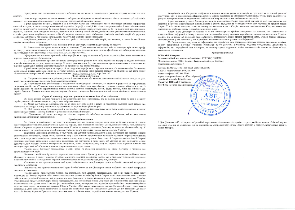 Цей Договір вважається укладеним між Споживачем та Виконавцем і набирає чинності з урахуванням вимог ст. 633, 634, 641, 642 Цивільного кодексу України, а саме шляхом приєднання Споживача до умов цього Договору: Фактом приєднання споживача до умов договору є прийняття пропозиції укласти договір (акцепт), вчинення споживачем будь-яких дій, які свідчать про його бажання укласти договір, зокрема надання виконавцю підписаної заяви про укладення договору (додаток до договору), сплата рахунка за надану послугу, факт споживання послуги.