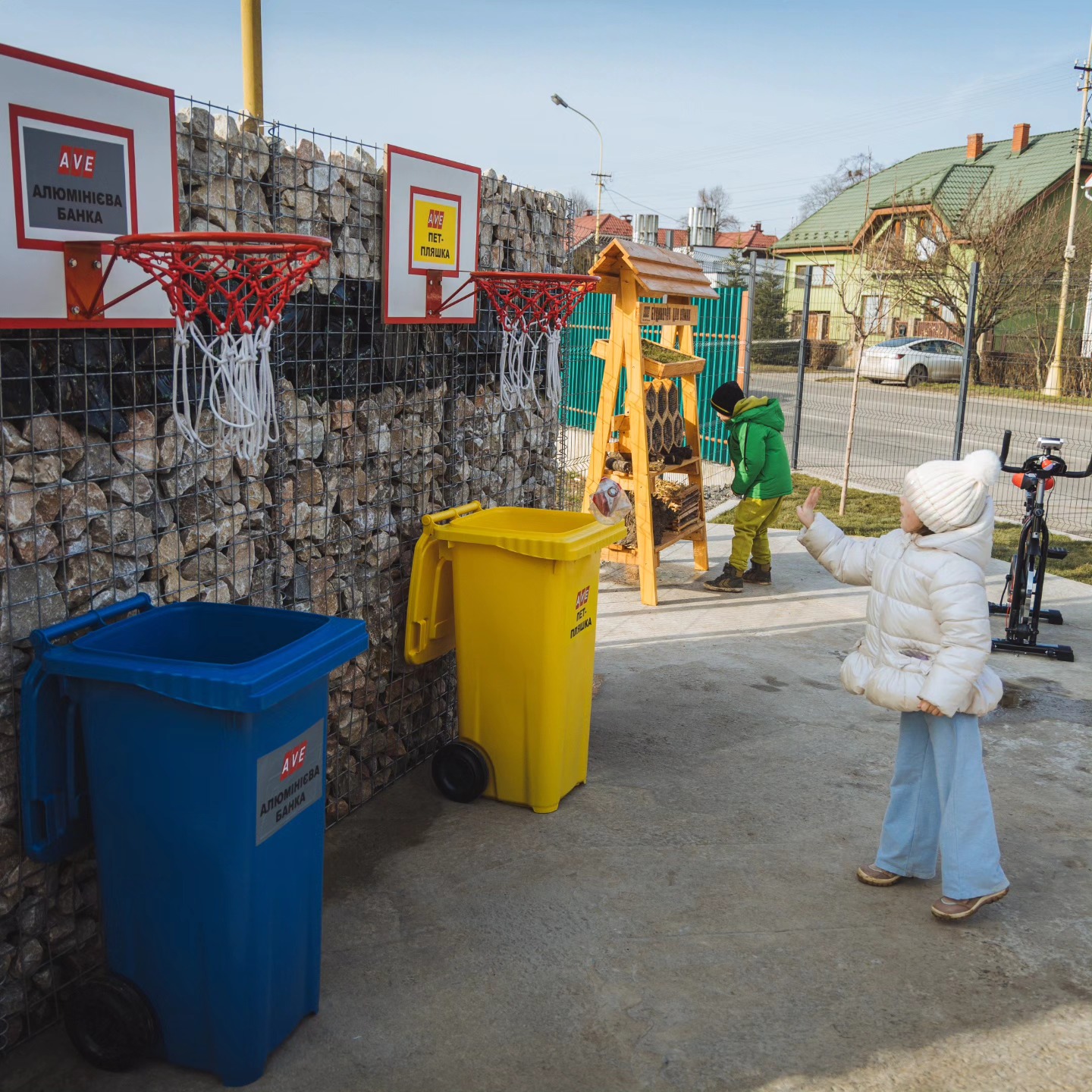 розміщено кошики для «екобаскетболу» — вторсировину можна влучно кидати в кошик, і вона одразу потрапляє до контейнера та багато цікавого