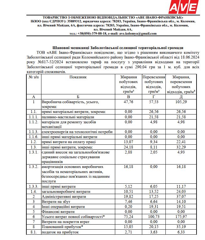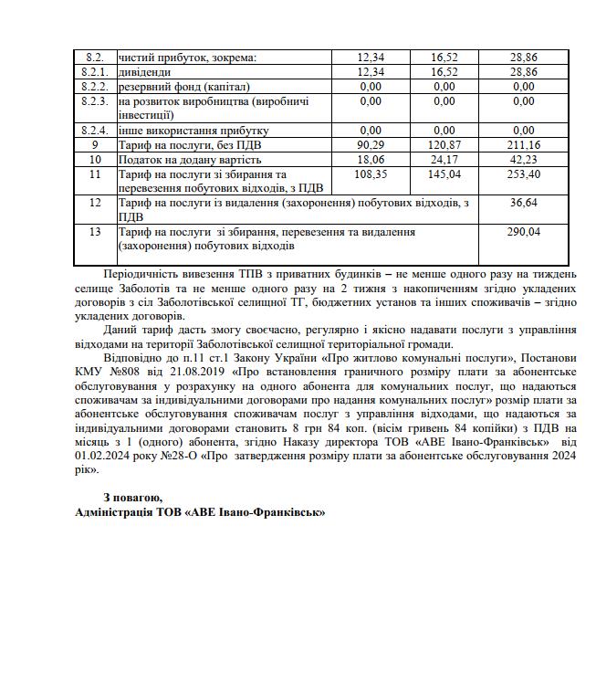 Заболотівська селищна територіальна громада: повідомлення про зміну тарифу на послугу управління побутовими відходами