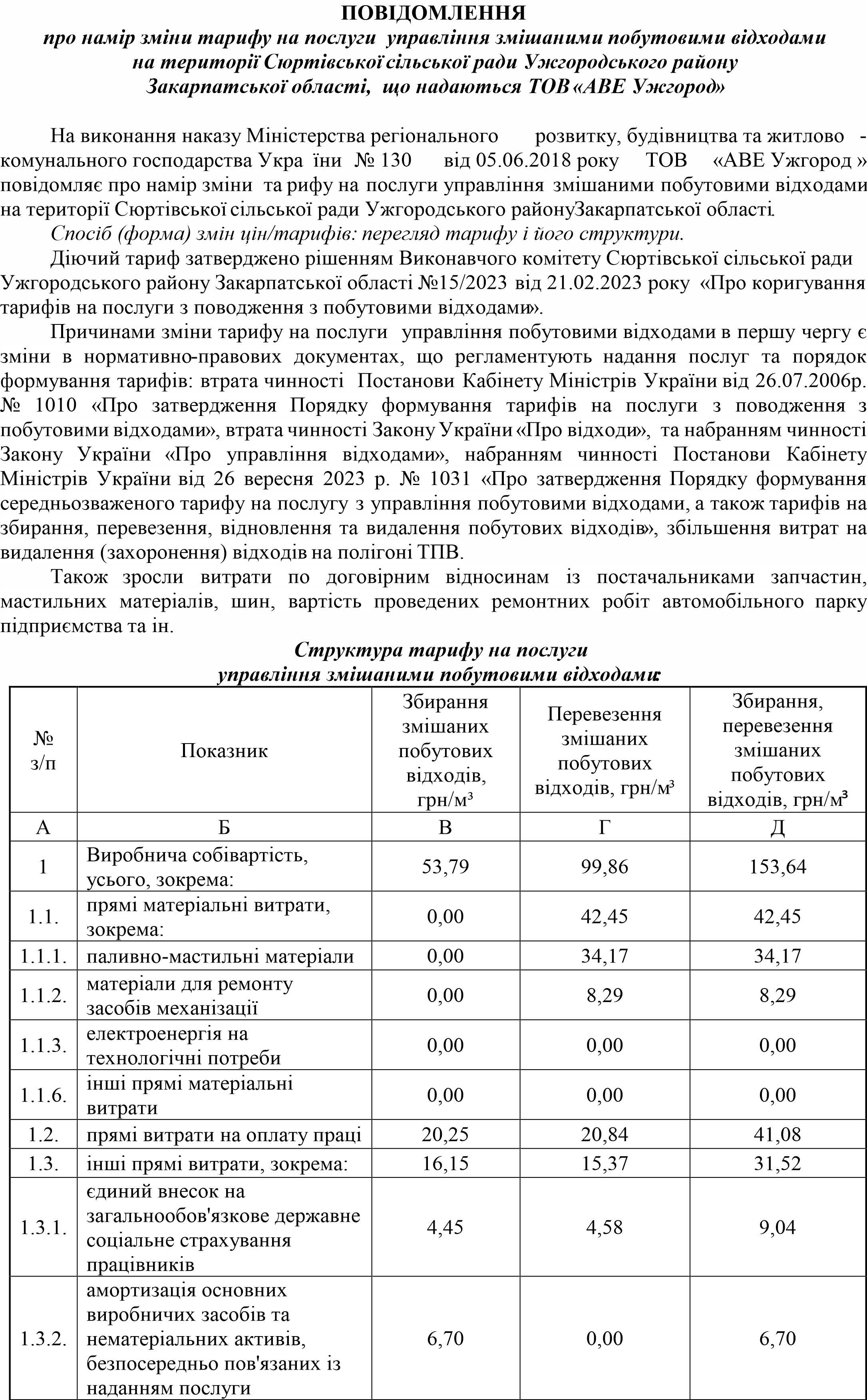 MESSAGE on the intention to change the tariff for mixed household waste management services on the territory of the Surtiv village council of the Uzhhorod district of Zakarpattia Oblast, provided by AVE Uzhhorod LLC
