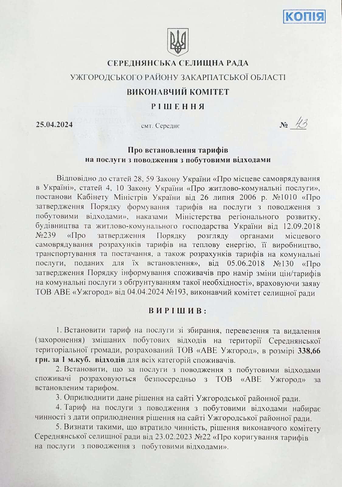 ТОВ «АВЕ Ужгород» повідомляє, що Рішенням Виконавчого комітету Середнянської селищної ради від 25.04.2024 року №43 затверджено середньозважений тариф на послуги з управління змішаними побутовими відходами на території Середнянської територіальної громади, який становить 338 грн. 66 коп. з ПДВ за 1 м. куб. для всіх категорій споживачів.