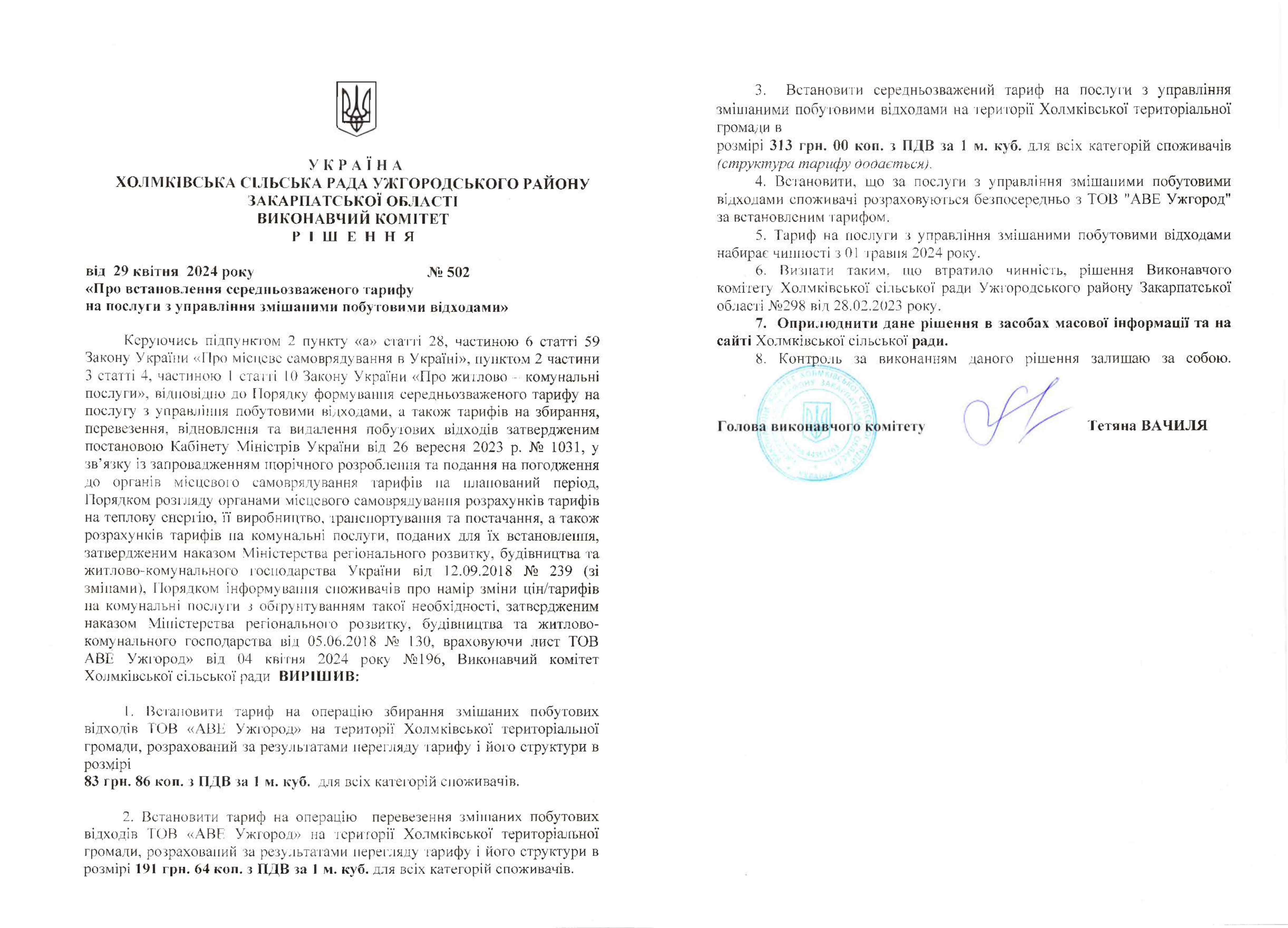 ТОВ «АВЕ Ужгород» повідомляє, що Рішенням Виконавчого комітету Холмківської сільської ради від 29.04.2024 року №502 затверджено середньозважений тариф на послуги з управління змішаними побутовими відходами на території Холмківської територіальної громади, який становить 313 грн. 00 коп. з ПДВ за 1 м. куб. для всіх категорій споживачів.