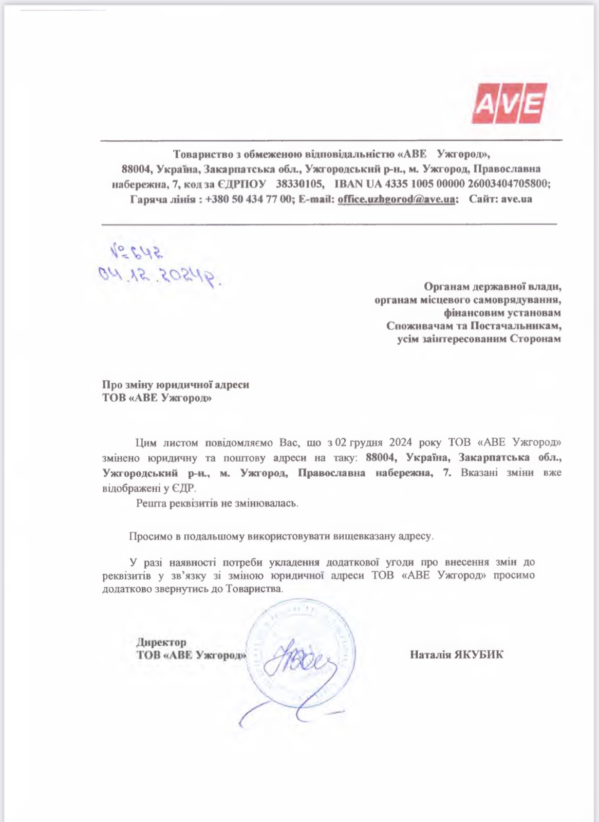 Цим листом повідомляємо Вас, що з 02 грудня 2024 року ТОВ «АВЕ Ужгород» змінено юридичну та поштову адреси на таку: 88004, Україна, Закарпатська обл., Ужгородський р-н., м. Ужгород, Православна набережна, 7. Вказані зміни вже відображені у ЄДР. Решта реквізитів не змінювалась.