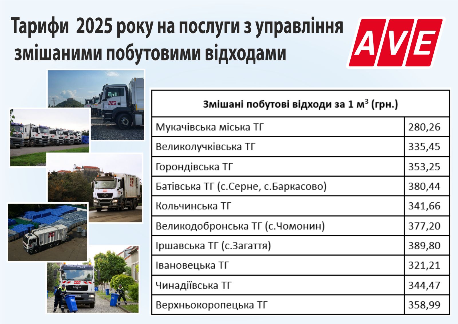 ТОВ “АВЕ МУКАЧЕВО” надає послуги з управління побутовими відходами, а саме — збирання, вивезення, сортування та захоронення побутових відходів за контейнерною та безконтейнерною схемами.